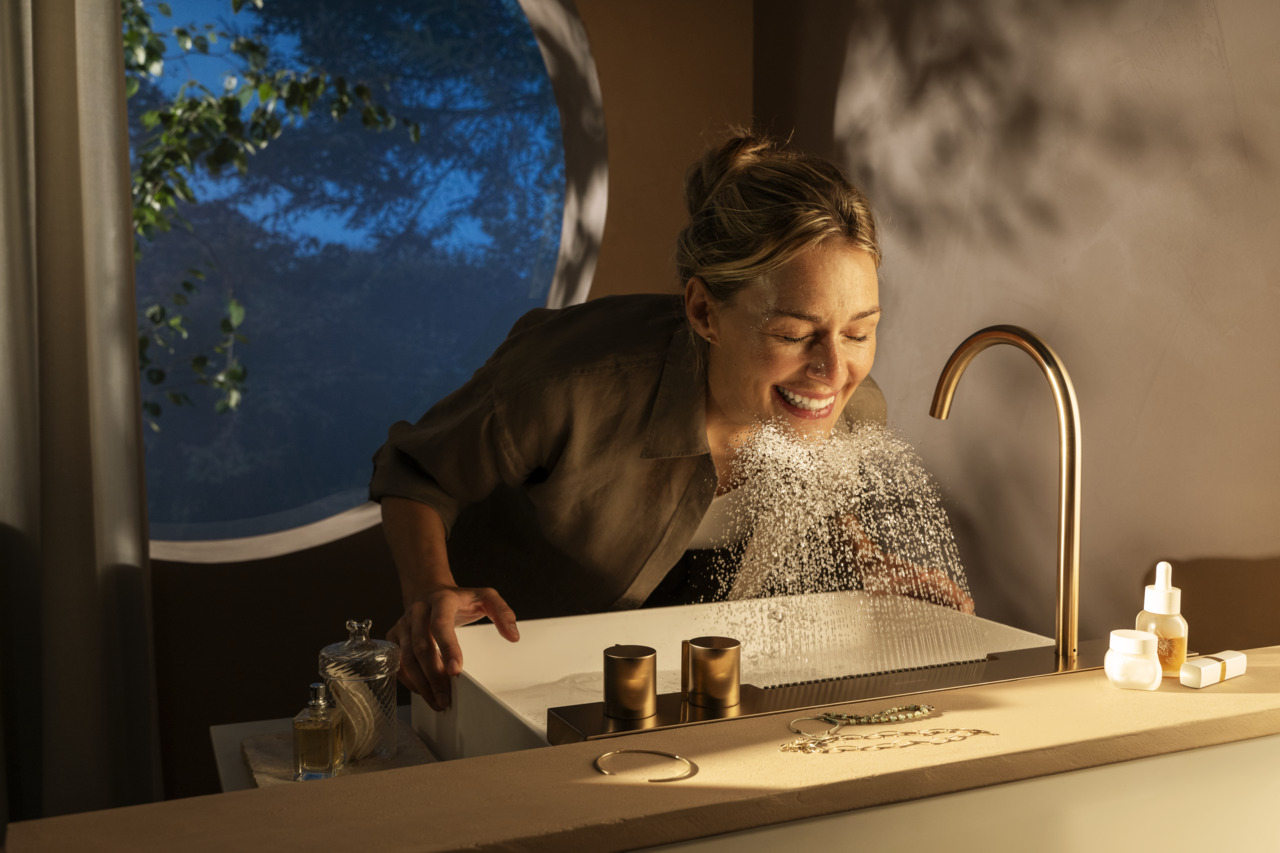 Avec Avalegra, hansgrohe réinvente le rituel au lavabo et le transforme en une expérience sensorielle. Le bec élancé et orientable, équipé d’un jet de douche intégré, crée une interaction inédite avec l’eau. Celle-ci s’élance en courbe depuis le centre du module de commande, offrant un geste à la fois naturel et surprenant. Grâce à un limiteur de pression, le débit reste plafonné à cinq litres par minute en mode douche, tout en préservant une agréable sensation de confort. L’eau se dépose ensuite avec délicatesse dans la vasque en Solid Surface, dont le design s’accorde parfaitement à la ligne du bec.